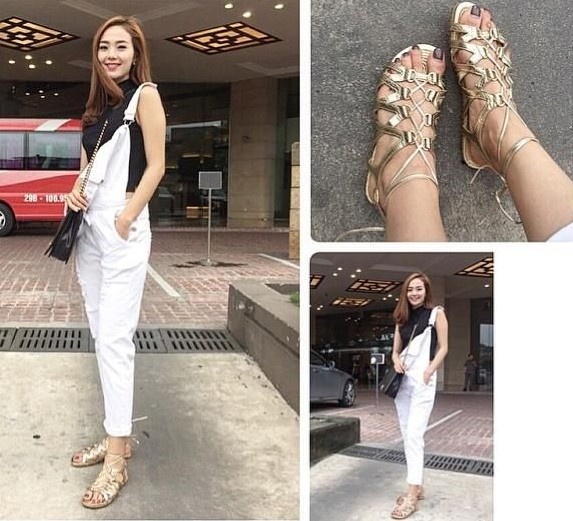 | Minh Hằng chọn kiểu áo tương tự nhưng cách mix có phần cá tính hơn với quần yếm và sandals chiến binh. |