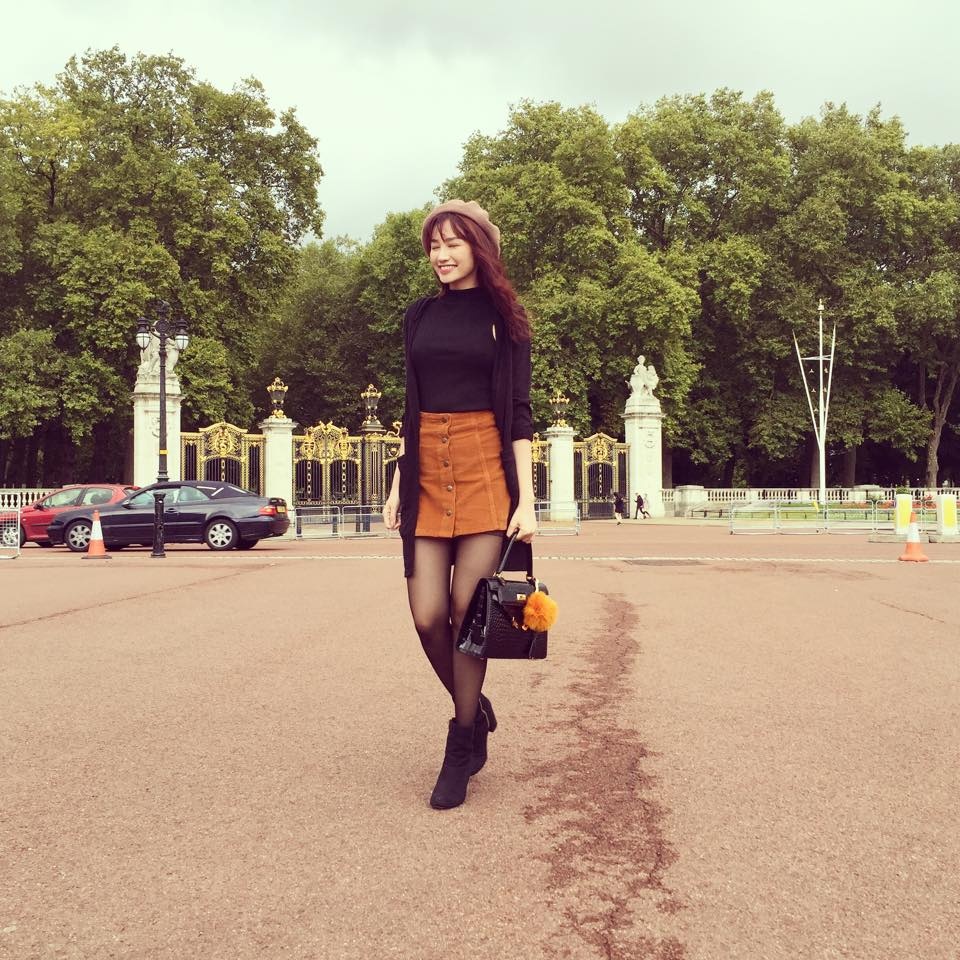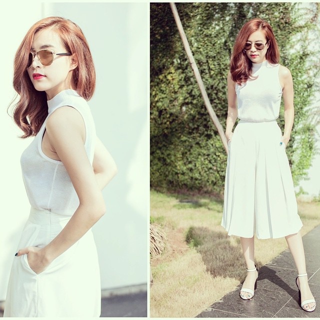 | Cây trắng của Hoàng Thùy Linh trở nên thanh lịch hơn với cách sử dụng áo cao cổ khoét nách đậm chất cổ điển. |