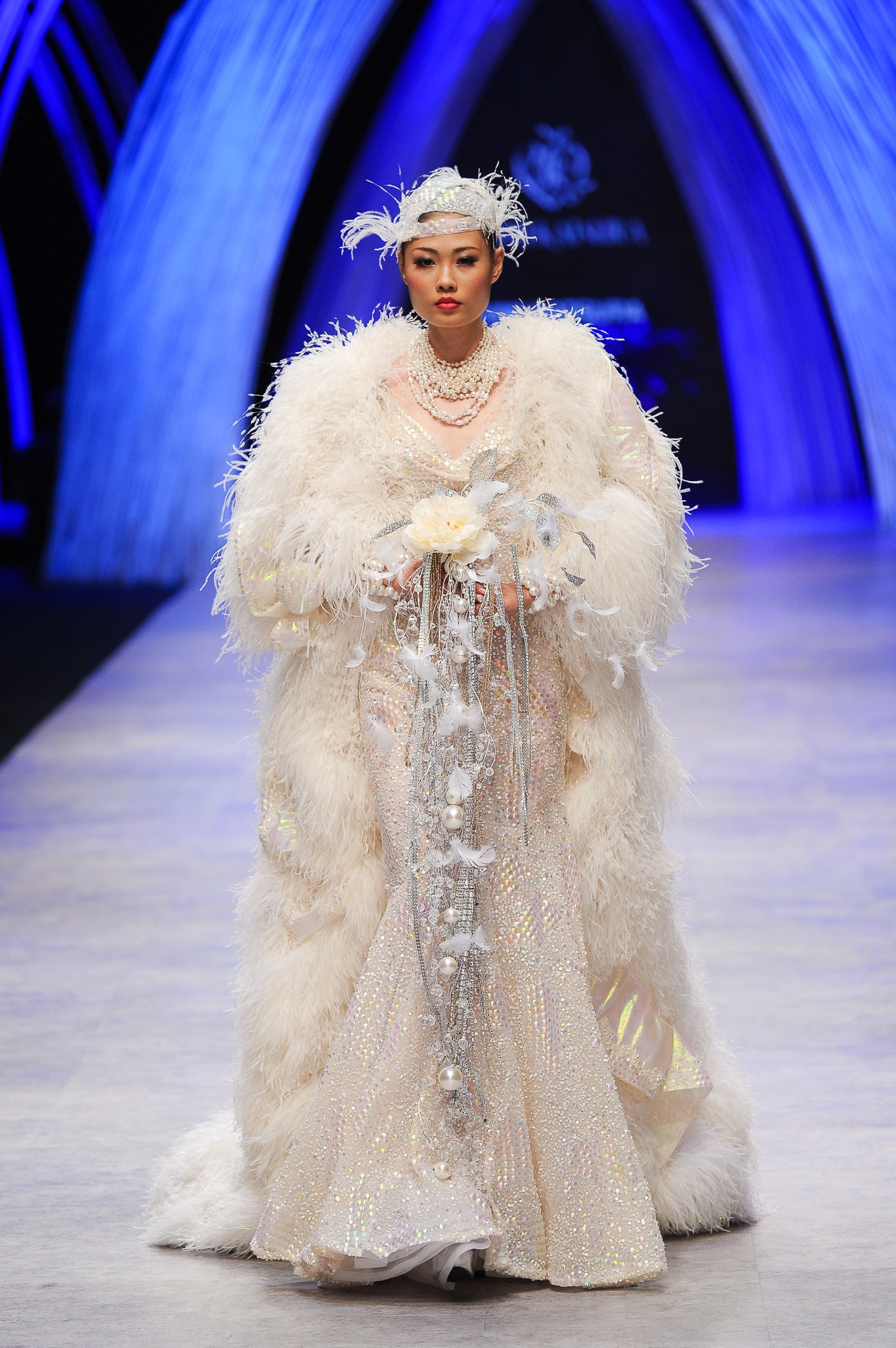 | Lần đầu tham gia Tuần lễ thời trang quốc tế Việt Nam, Yumi Katsura giới thiệu bộ sưu tập áo cưới kỳ công với nhiều phụ kiện trị giá hàng triệu đô. Các sản phẩm thời trang lần này còn phảng phất nét văn hóa xứ sở mặt trời mọc. Trong ảnh, Mai Giang xuất hiện ấn tượng trong thiết kế váy cưới kết hạt, kết hợp áo khoác lông và phụ kiện hoa cưới đắt đỏ. |
