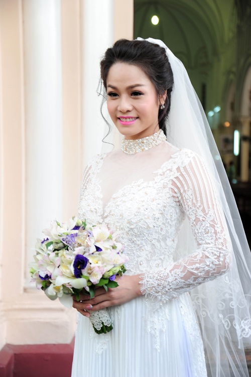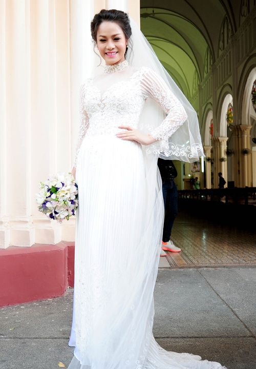 | Khi cùng chồng hành lễ tại nhà thờ Chợ Quán, TP.HCM, nữ diễn viên phim Long Thành cầm giả ca diện bộ áo dài cưới gam màu trắng trong trẻo của NTK Minh Châu. Thiết kế có chất liệu ren mỏng mềm mại, kết hợp voan trong suốt gợi cảm ở thân trên. Cô dâu Nhật Kim Anh khá quyến rũ trong thiết kế có gam màu ưa thích. Người đẹp cũng khéo léo chọn kiểu tóc ăn nhập trang phục. |