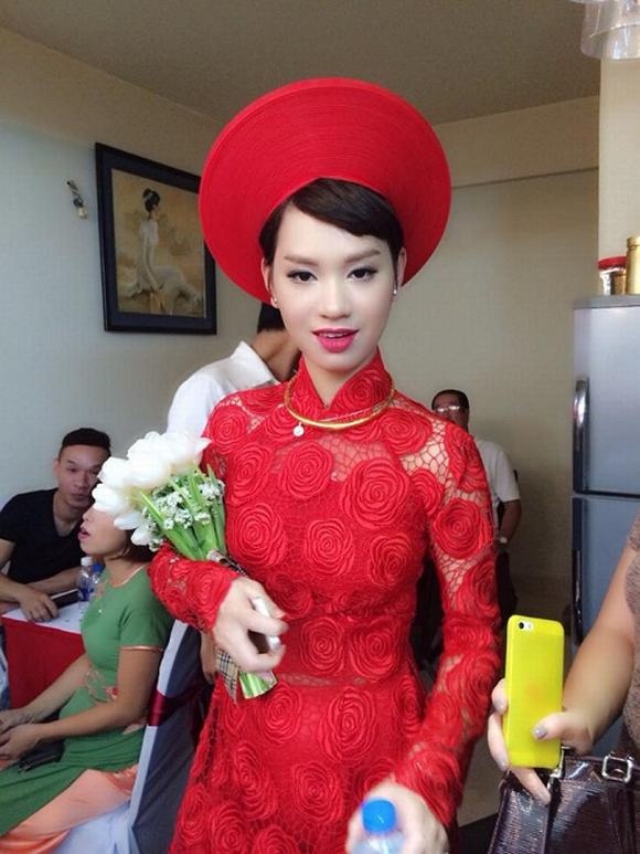 Lễ thành hôn của Trà My Idol và ông xã đại gia diễn ra vào ngày 14/6. Trong ngày vui của mình, cô dâu cá tính chọn mẫu áo dài tông màu đỏ nổi bật, có họa tiết hoa hồng trải đều trên thân áo. Thiết kế được cho là khá sành điệu và rất phù hợp với phong cách của cô dâu. Tông màu làm nổi bật làn da trắng hồng của nữ ca sĩ Hà thành.