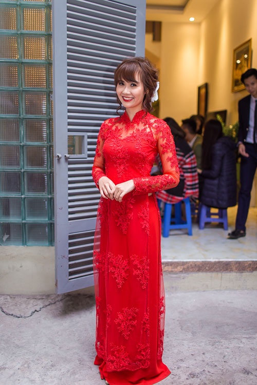 Tại lễ rước dâu diễn ra vào sáng ngày 15/2, cô dâu Quỳnh Anh thanh thoát trong bộ áo dài tông màu đỏ trơn khá nền nã, thanh lịch. Thiết kế tối giản và không dính họa tiết cầu kỳ nhưng vẫn tạo được sức hút riêng cho người mặc.