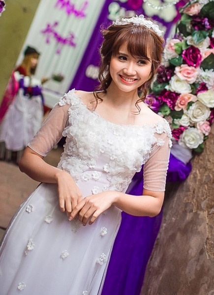 | Kế đến, cô dâu hot girl chọn mẫu áo dài voan ren trắng thanh lịch. Thiết kế cũng được cách điệu với những đường cắt hiện đại, tối tân, lược bỏ cổ áo kín đáo và cánh tay. Chất liệu voan ren mỏng, đính hoa 3D mang lại nét nữ tính, yêu kiều. Kiểu tóc búi lãng mạn của cô dâu 24 tuổi kết hợp ăn ý cùng mẫu áo dài cách tân này. |