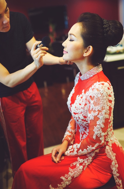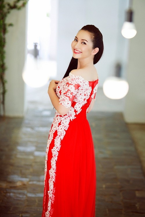 | Mẫu áo dài được đính kết khá tỉ mỉ với chất liệu voan mềm cao cấp. Tông màu trắng và đỏ tôn sức hút của bà mẹ một con. Tông trang điểm và kiểu tóc búi sang trọng cũng rất phù hợp với hình tượng cô dâu quyến rũ mà Kim Hiền hướng đến. |