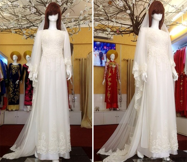Áo dài cưới chất liệu voan ren xuyên thấu, gợi cảm được đa số các cô dâu làng giải trí ưa chuộng.