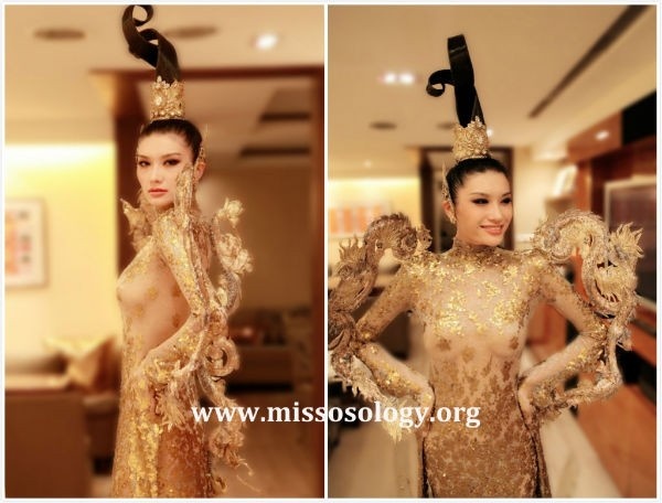 | Quốc phục của Hoa hậu Trung Quốc Cận Diệp với thiết kế “rồng bay lên” bằng vải mỏng và dát vàng. |
