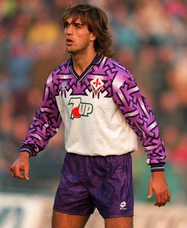 Cựu danh thủ Gabriel Batistuta từng mặc chiếc áo ràng ri của Fiorentina năm 1992.