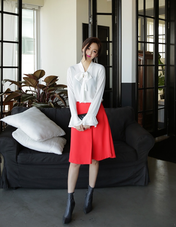 | Cô nàng công sở dịu dàng với váy xòe mix kèm sơ mi tay bèo duyên dáng, trẻ trung. |