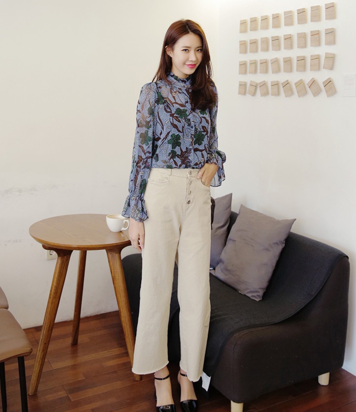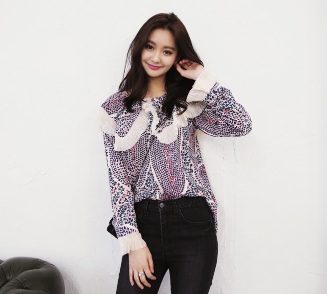 | Một chút rực rỡ với áo họa tiết xếp cổ sen bèo hết sức nữ tính. |