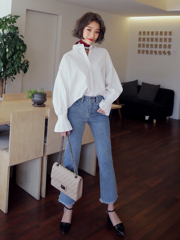 | Các cô nàng cá tính cũng có lựa chọn với kiểu áo sơ mi trắng với biến tấu một chút ở phần tay áo lạ mắt. |