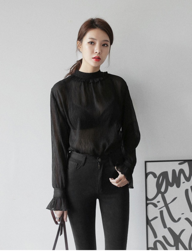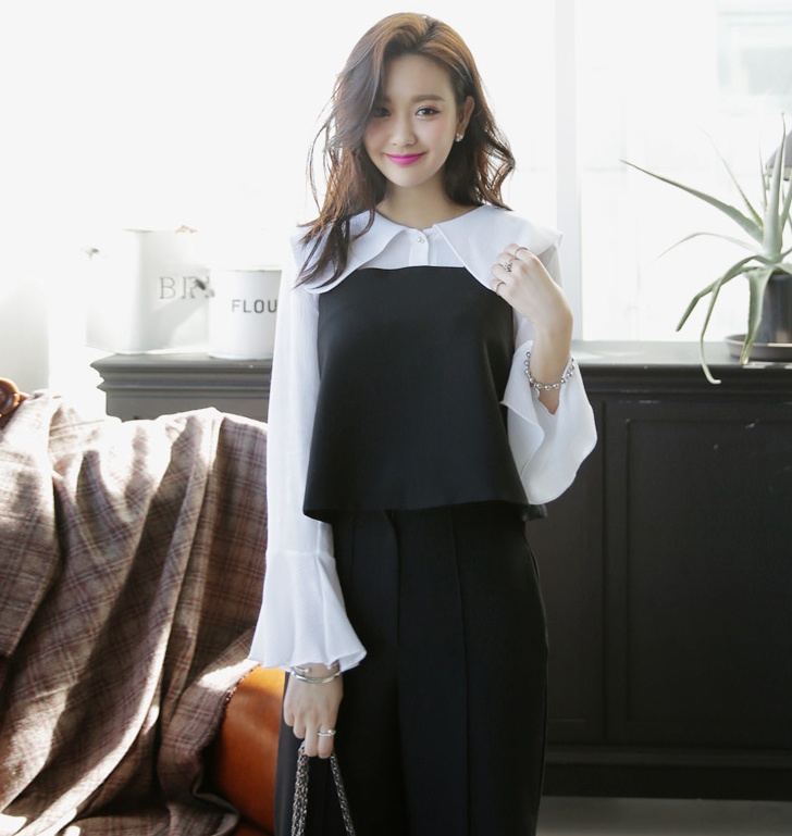 | Áo tay bèo mix kèm quần đen cá tính, năng động. |
