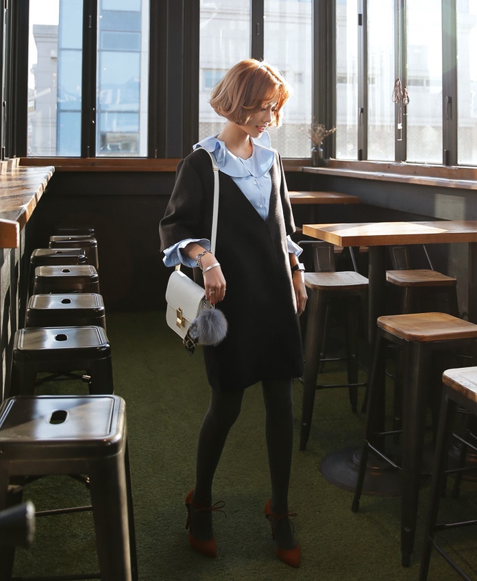 | Gợi ý cách kết hợp áo cổ bèo với váy dạ dáng suông thích hợp những ngày se lạnh. |