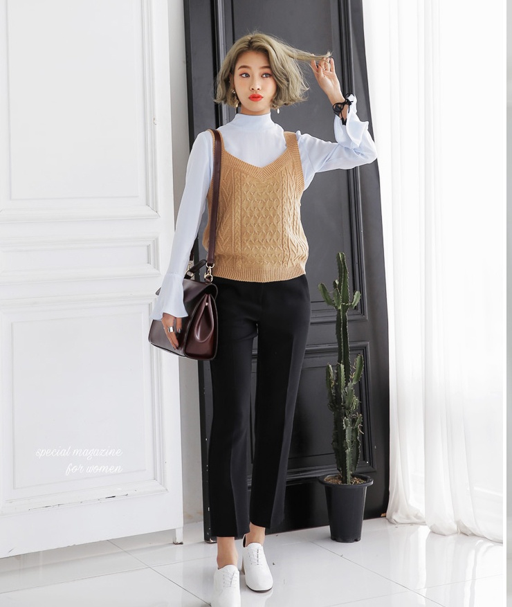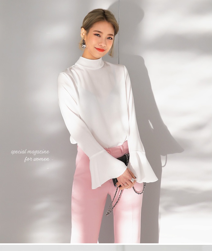 | Thời trang ngày xuân hết sức duyên dáng với áo cao cổ tay bèo mix kèm quần pastel dịu dàng. |