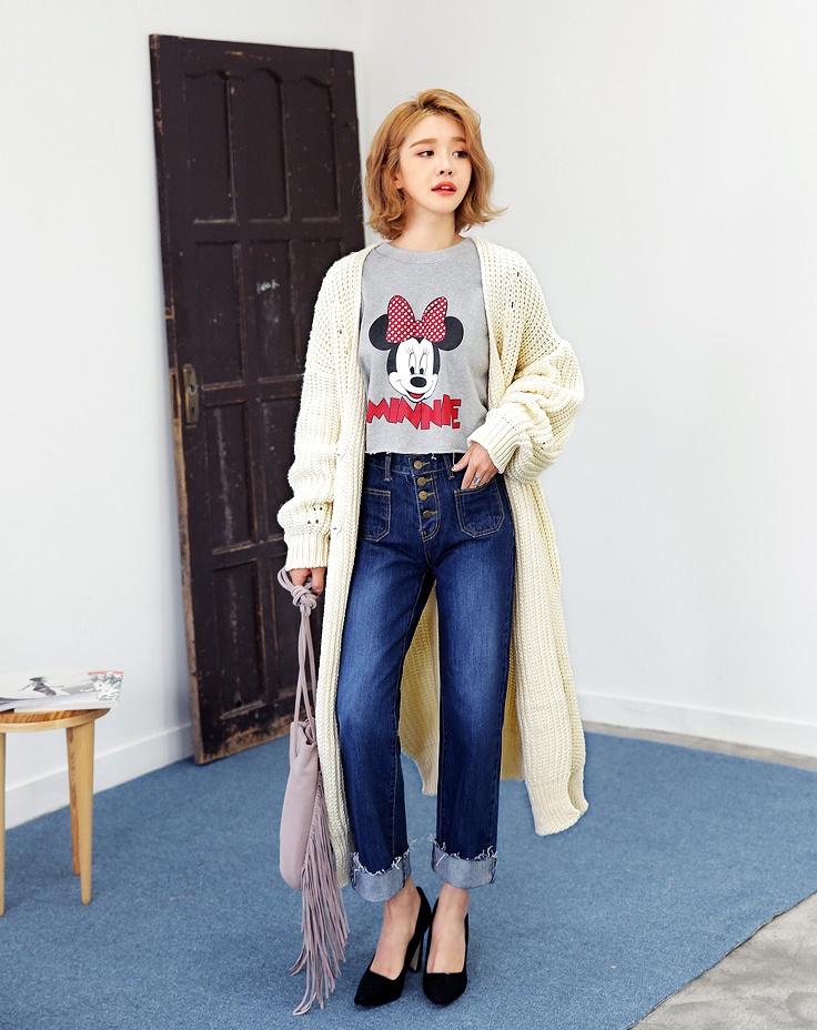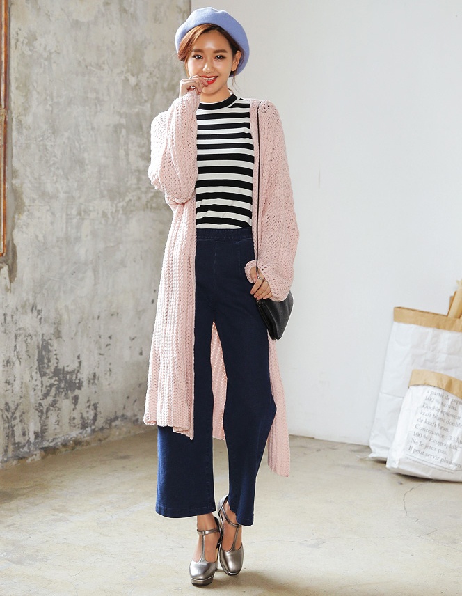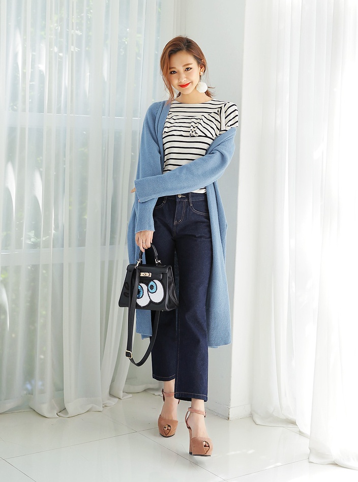 | Phong cách trẻ trung khi mix kèm áo thun kẻ và quần jeans lửng với áo len khoác dáng dài. |