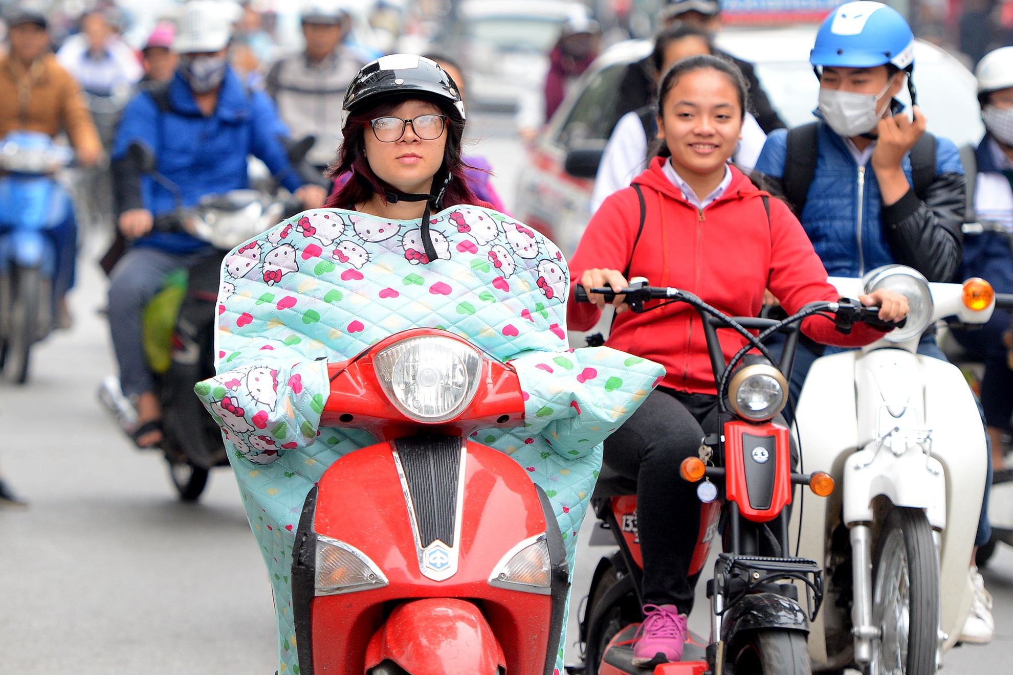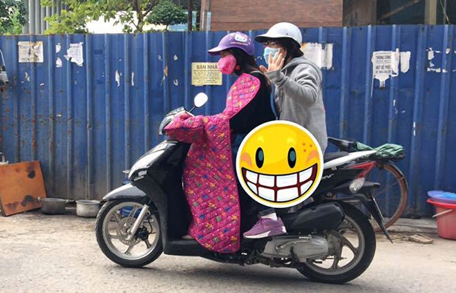 | Tại Facebook sáng nay cũng xuất hiện một số hình ảnh người đi đường mặc "chăn bông" chạy xe trên phố. |