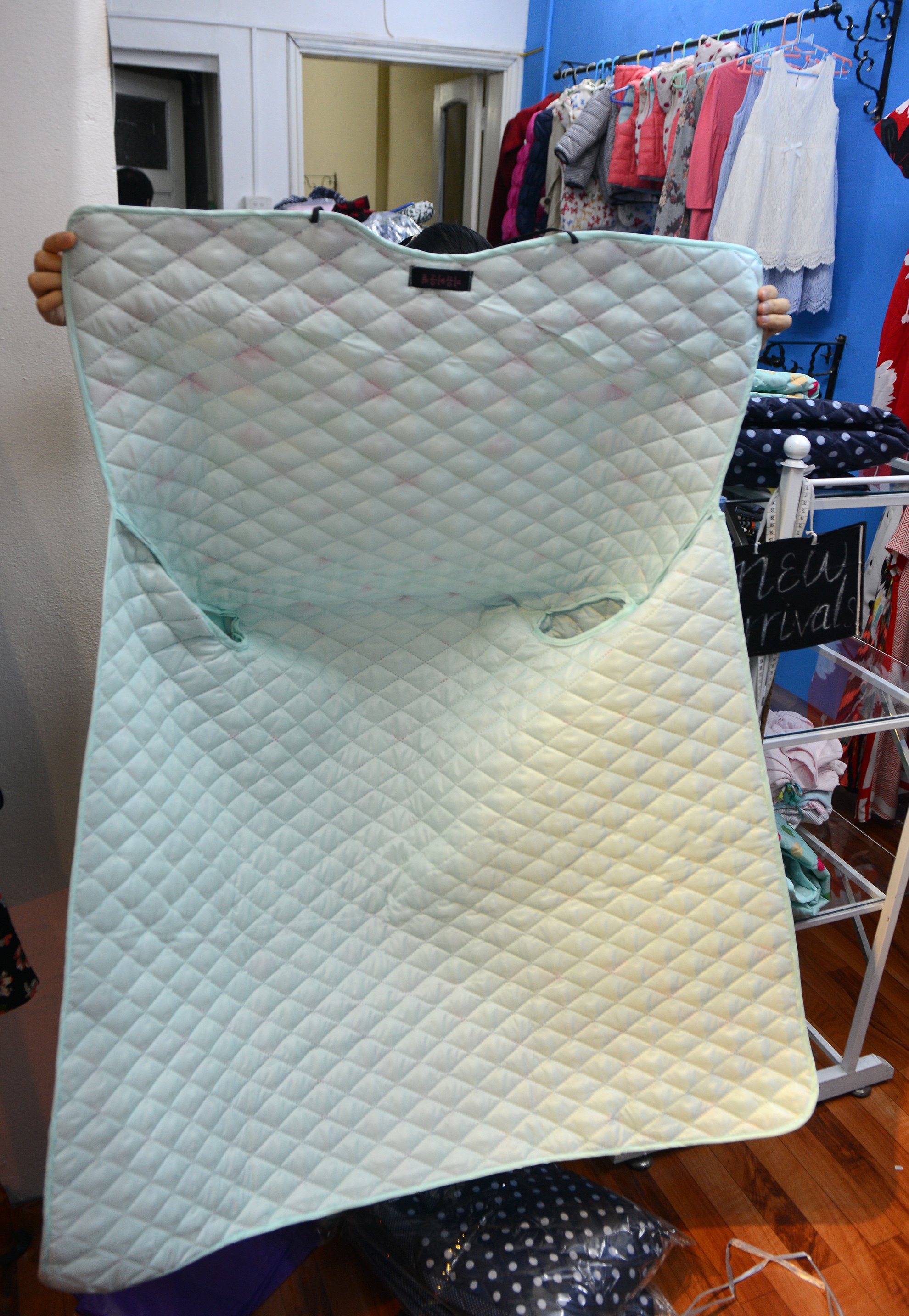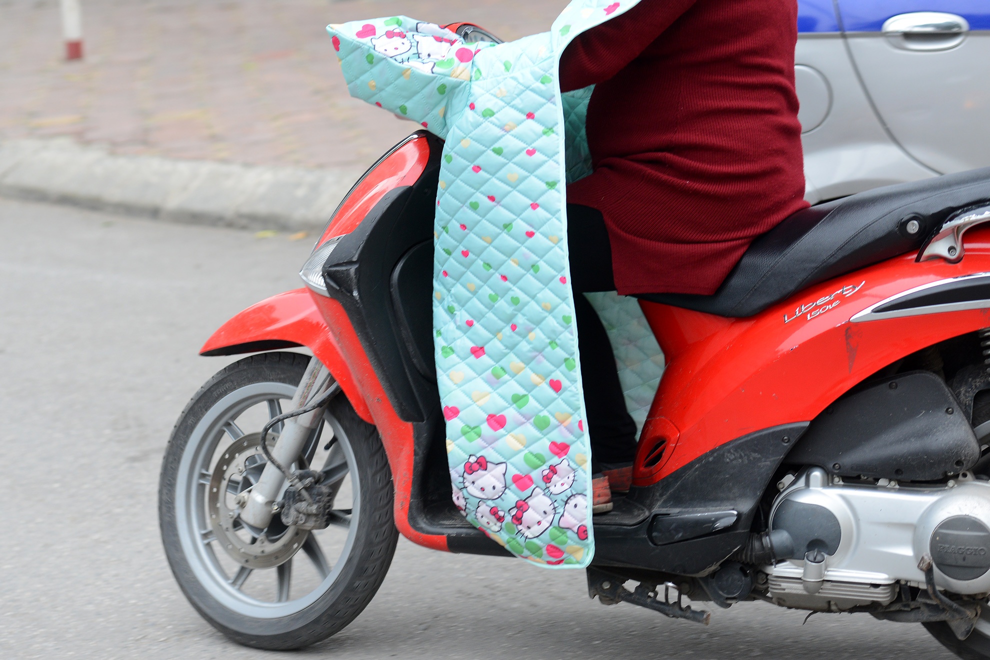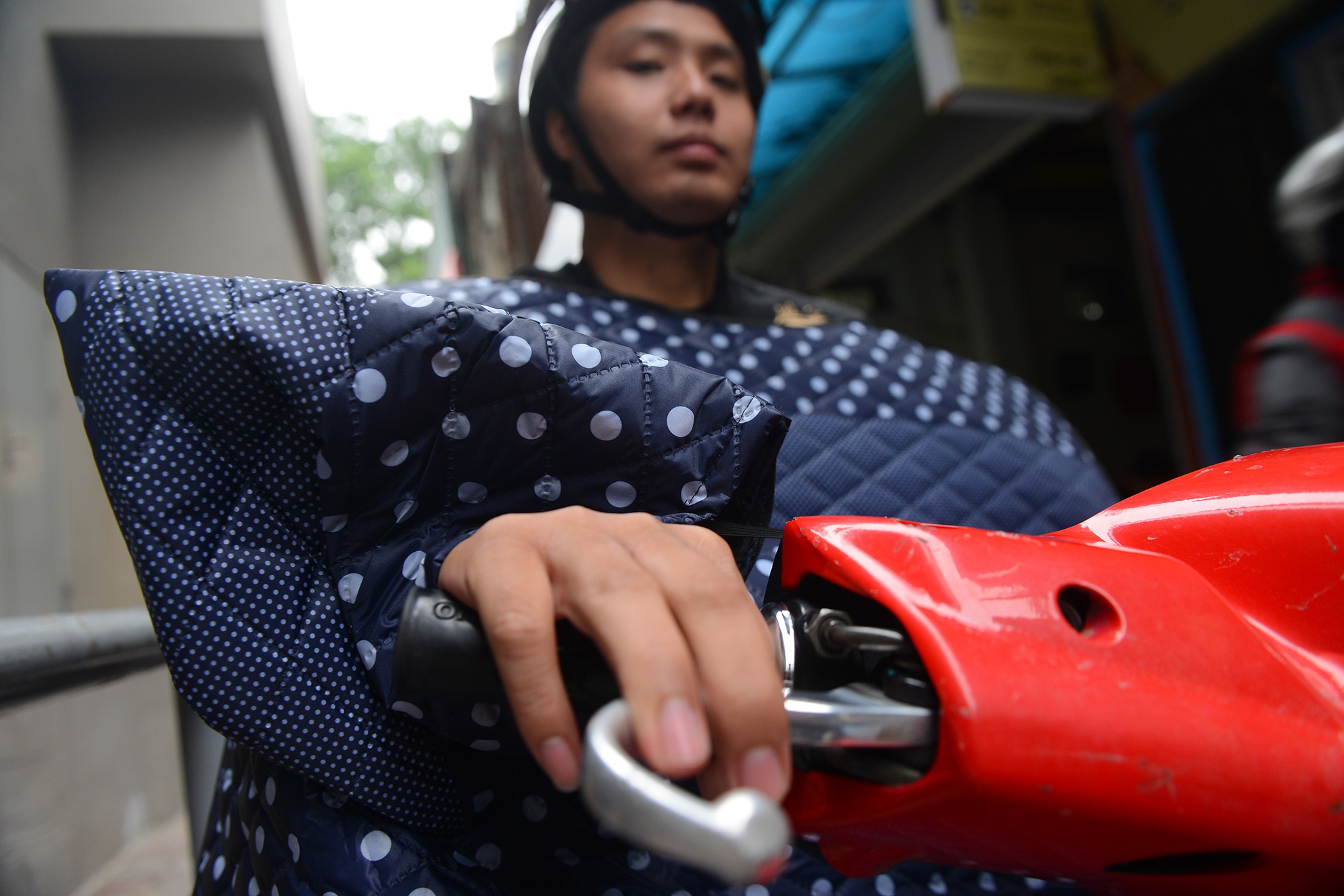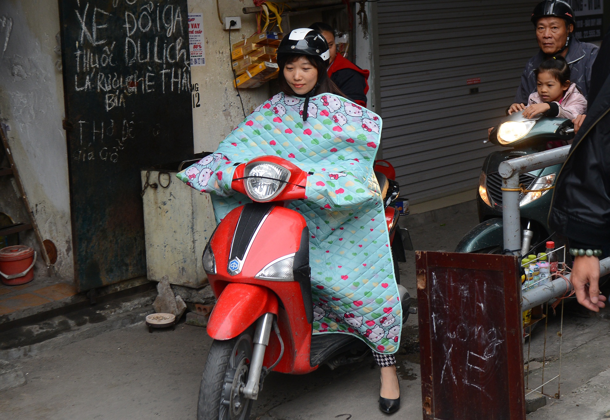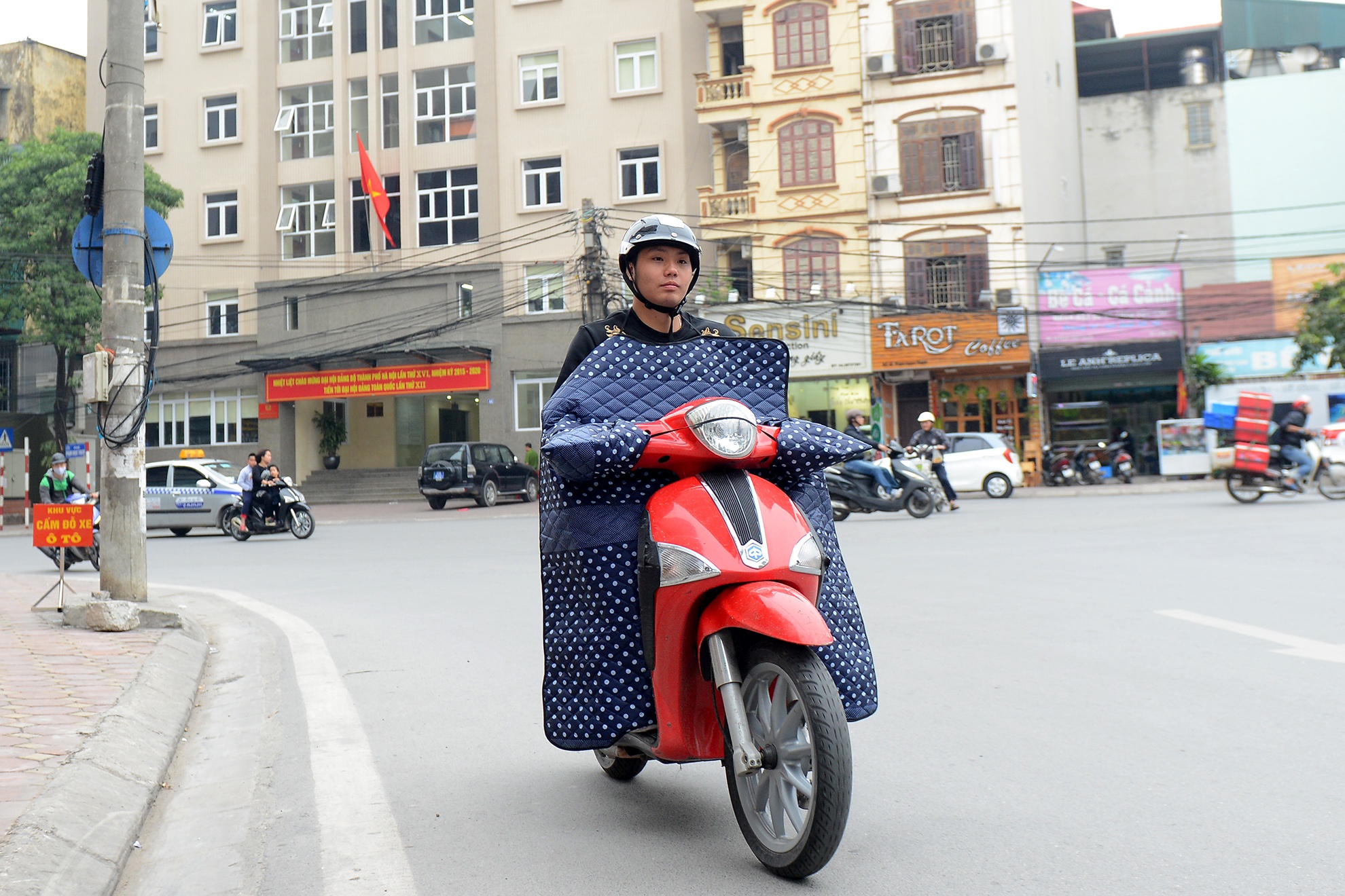 Sản phẩm áo chống rét phủ kín từ cổ tới chân, tay khiến cho thoáng qua, nhiều người lầm tưởng các chàng trai, cô gái đang khoác chăn bông đi xe máy.