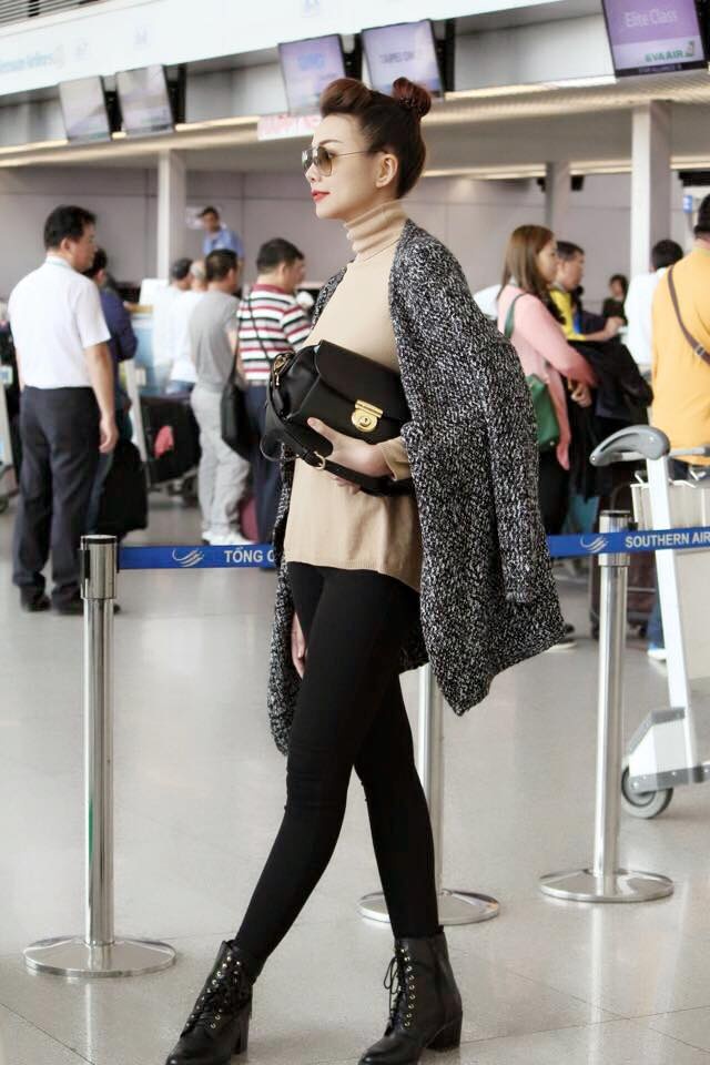 | Thanh Hằng khoe dáng cùng set áo len cao cổ và quần skinny, áo cardigan trẻ trung. |