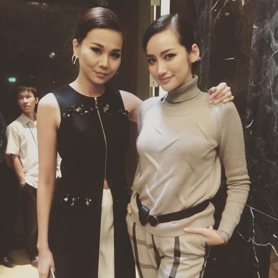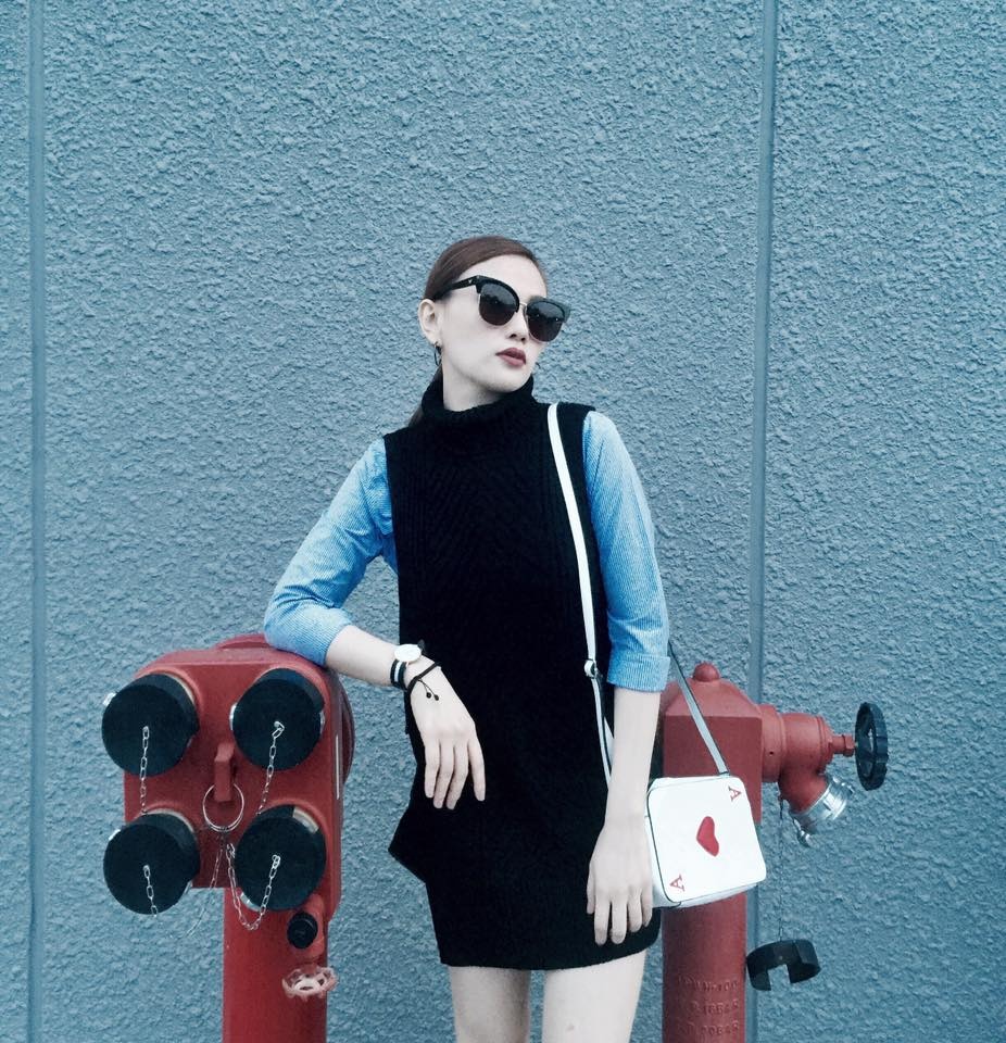 | Hạ Vi, người tình tin đồn của Cường Đôla với chiếc áo len cao cổ khoét nách giúp khoe vẻ năng động. |
