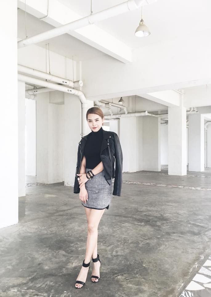 | Hải Băng kết hợp áo len cao cổ và áo khoác da trẻ trung. |