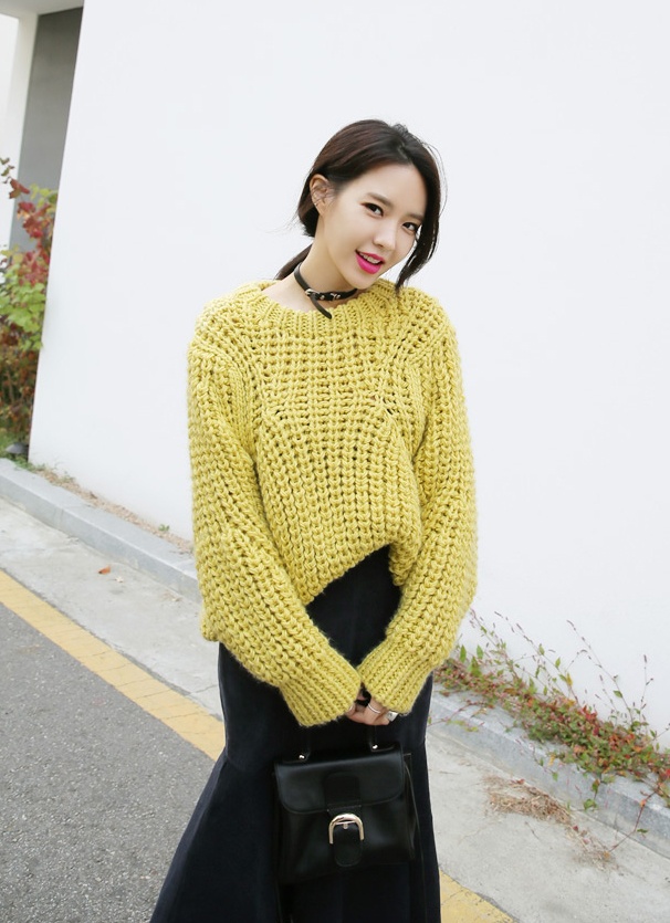 | Mẫu áo len thô cũng có thể mix kèm các kiểu chân váy với tông màu và thiết kế đơn giản để tránh cảm giác rối mắt. |