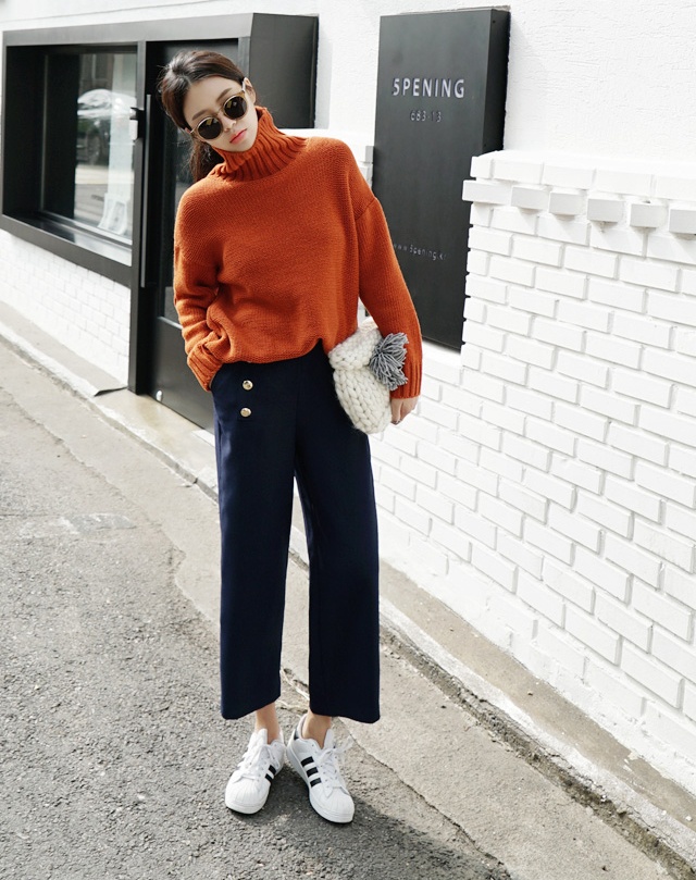 | Vẻ trẻ trung của cô gái với cách mix áo len cao cổ có tông màu rực rỡ và quần lửng, giày sneakers. |