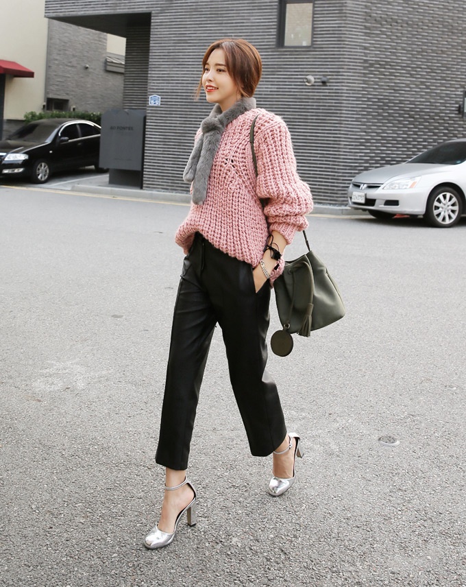 | Áo len đan sợi thô khỏe khoắn mix kèm quần âu với tông màu tươi tắn. |