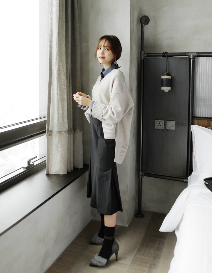 | Cô nàng công sở có thể dùng áo len xẻ mix kèm váy midi duyên dáng. |