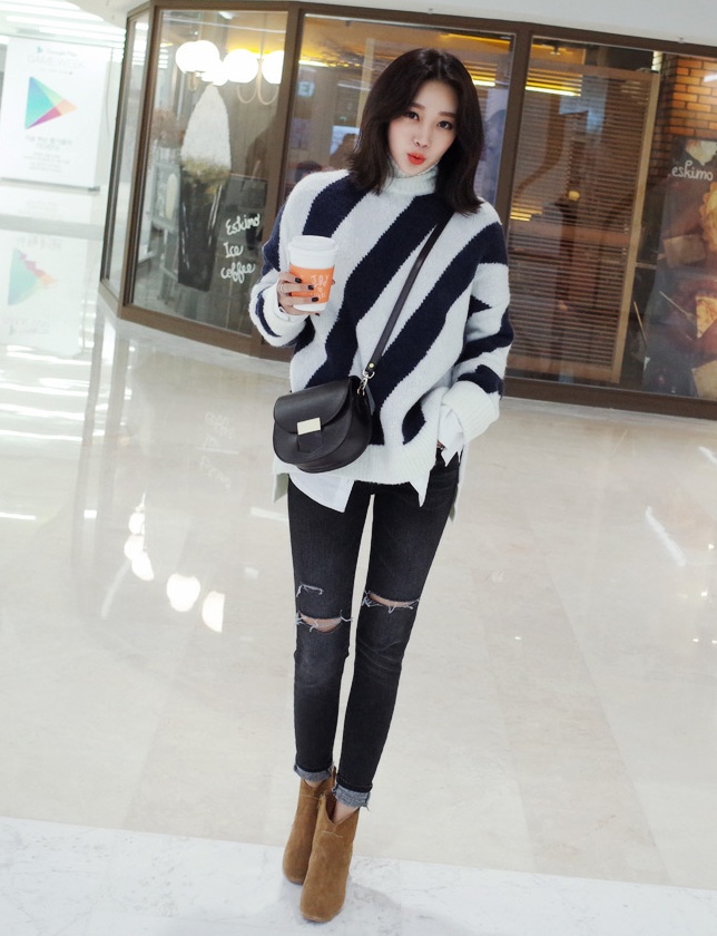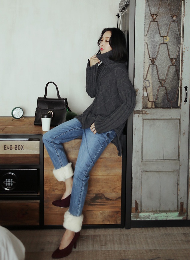 | Gợi ý cách kết hợp áo len xẻ và quần da, bốt cao cổ ngày đại hàn. |