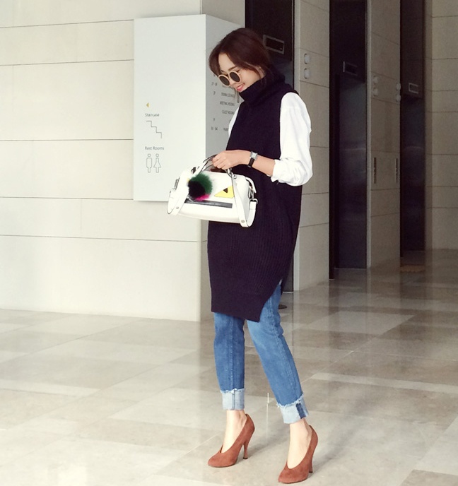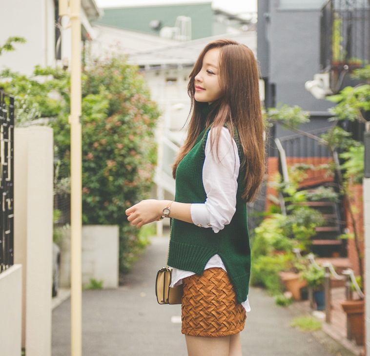 | Phong cách hơn với áo len gillet xẻ và sơ mi trắng xinh xắn. |
