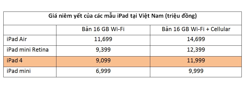Đây là một mức giá niêm yết khá tốt của Apple, nếu biết rằng nhiều cửa hàng xách tay vẫn cho bán mẫu iPad 4 bản 16 GB 3G với giá 11,5 - 12 triệu đồng.