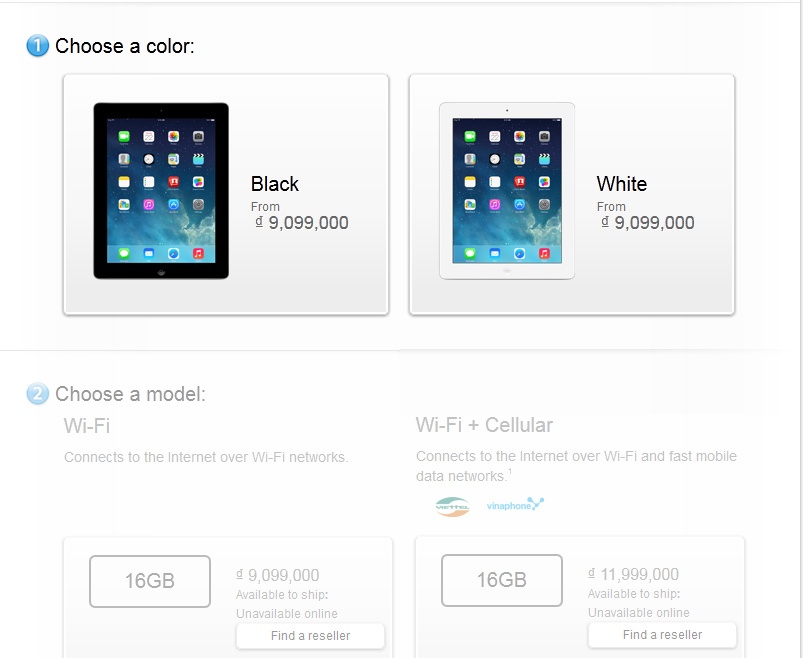 Ngay sau khi công bố khai tử iPad 2 và thay thế bằng mẫu iPad 4 (iPad with Retina display), Apple đã nhanh chóng cho niêm yết giá bán của sản phẩm này trên hệ thống website tại Việt Nam. Theo đó, iPad 4 sẽ chỉ có 2 bản là 16 GB Wi-Fi và 16 GB Wi-Fi + Cellular với giá bán lần lượt là 9,1 và 12 triệu đồng.