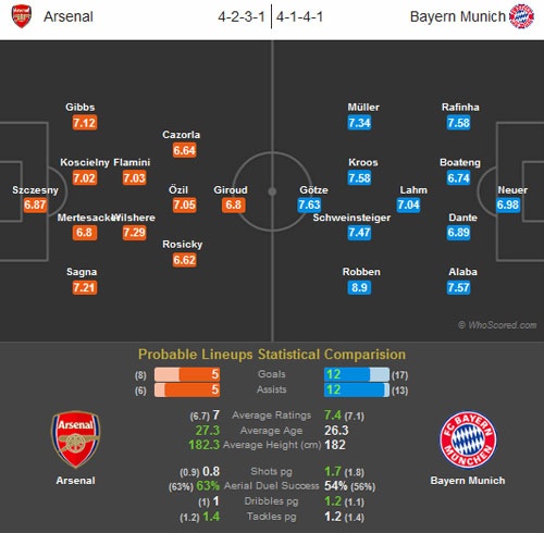 Tuy nhiên, khá đáng tiếc cho Pháo thủ khi thiếu vắng một vài tiền vệ trụ cột như Mikel Arteta do bị cấm thi đấu hay Aaron Ramsey đang phải điều trị chấn thương. Tuy nhiên, những nhân tố thay thế vẫn đang hoàn thành tốt nhiệm vụ mỗi khi được HLV Wenger sử dụng. Với điểm tựa sân nhà Emirates khi có 13 trận bất bại gần đây, Pháo thủ tự tin hướng tới một kết quả tích cực trước nhà vô địch Bayern.