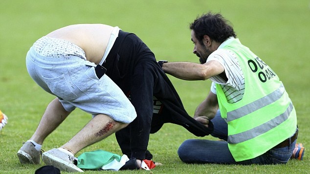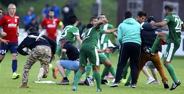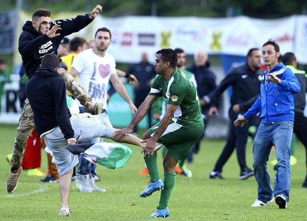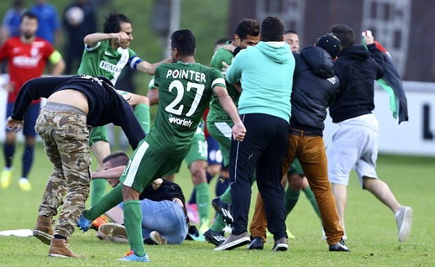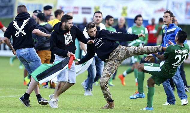 | Một nhóm các CĐV quá khích người bản địa bất ngờ lao vào sân tấn công các cầu thủ Maccabi Haifa. |