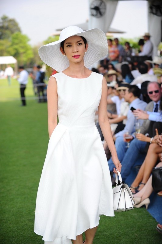 Cựu người mẫu Xuân Lan diện bộ đầm tông trắng trong trẻo, lịch thiệp phù hợp với không gian sự kiện ngoài trời. Phụ kiện mũ rộng vành và túi xách đồng tông giúp bà mẹ một con nổi bật một cách duyên dáng. Hình ảnh đẹp mang lại điểm cộng cho nữ giám khảo Vietnam's Next Top Model.