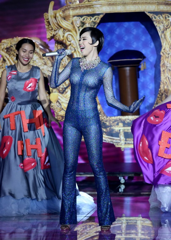 Trang phục trình diễn của Tóc Tiên giúp cô tạo được hiệu ứng phần nhìn khi bước lên sân khấu The Remix. Tuần này, người đẹp diện bộ cánh jumpsuit ánh kim bắt mắt. Thiết kế ôm sát vóc dáng khoe đường cong gợi cảm giúp cô nổi bật dưới ánh đèn sân khấu.