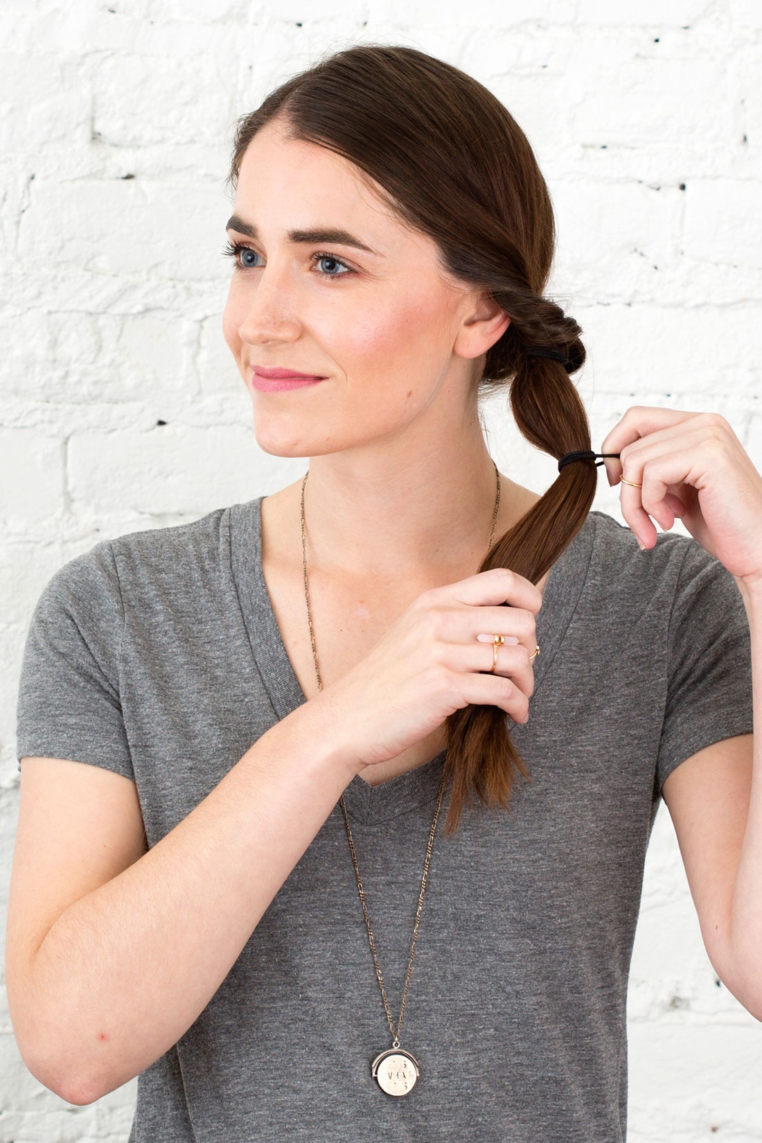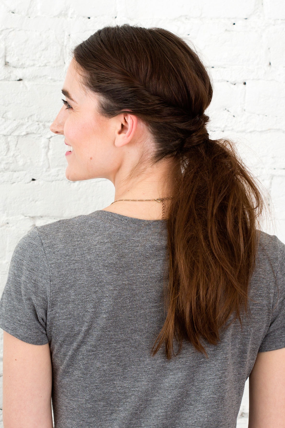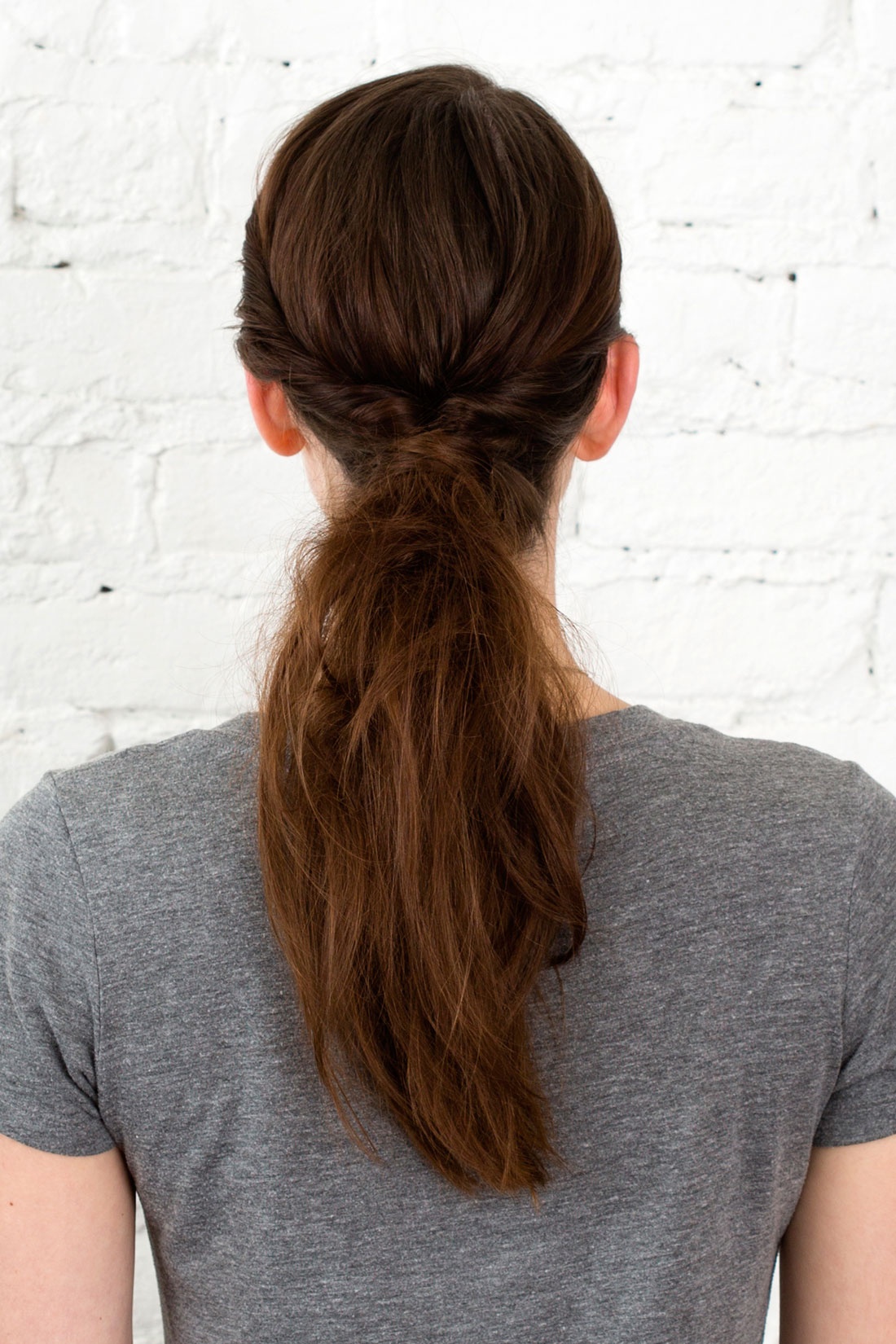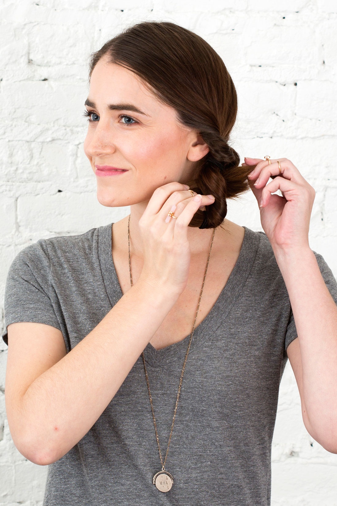 Để thực hiện kiểu tóc này, bạn chia tóc thành 3 phần, với phần tóc hai bên thái dương, xoắn chặt tóc kéo từ phía thái dương xuống dưới và cột lại với phần tóc phía sau gáy, sau khi hoàn thành dùng một phần tóc quấn quanh thun để giấu sợi thun.