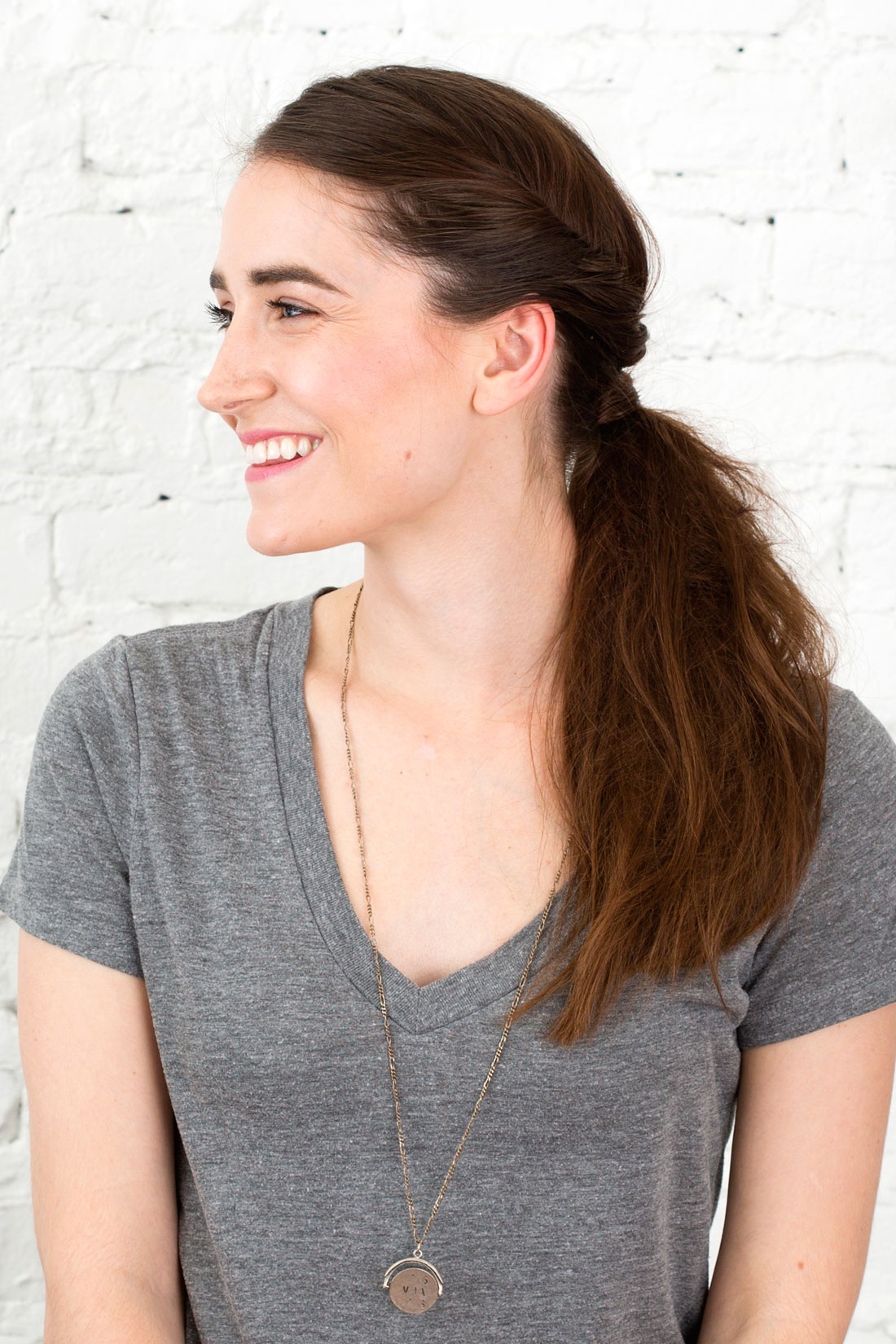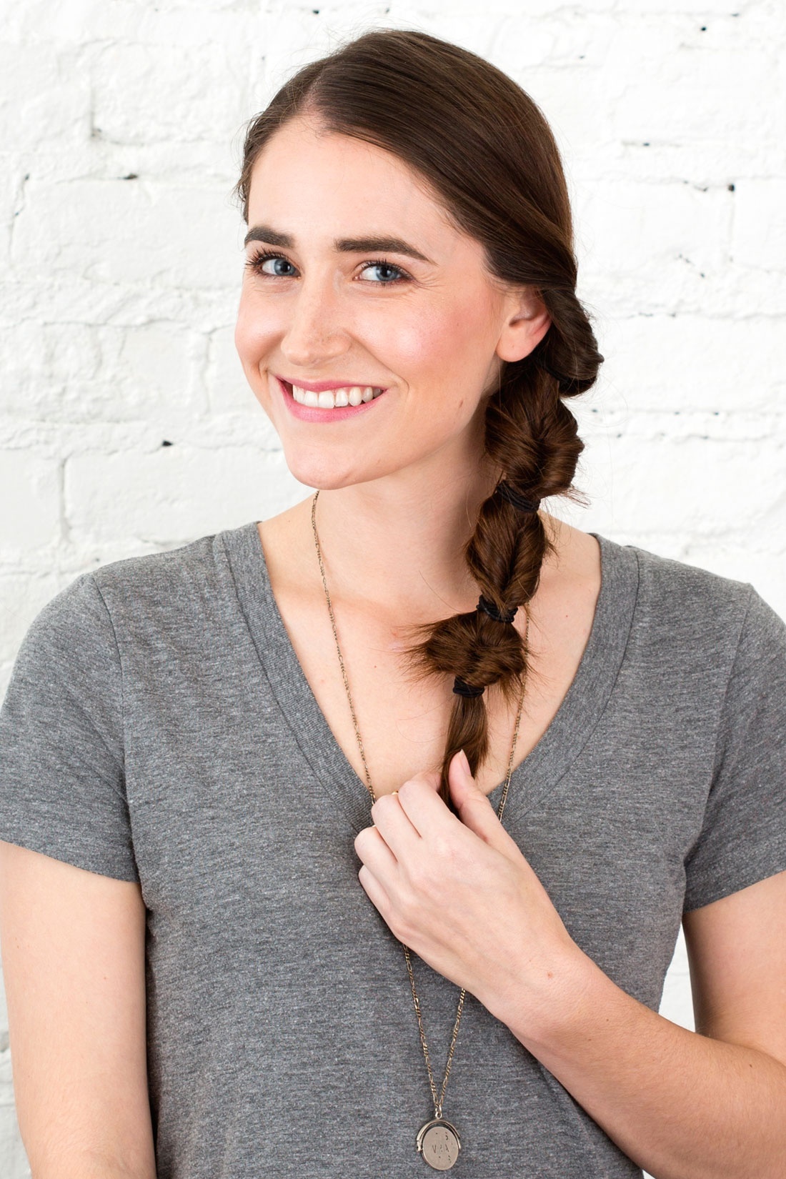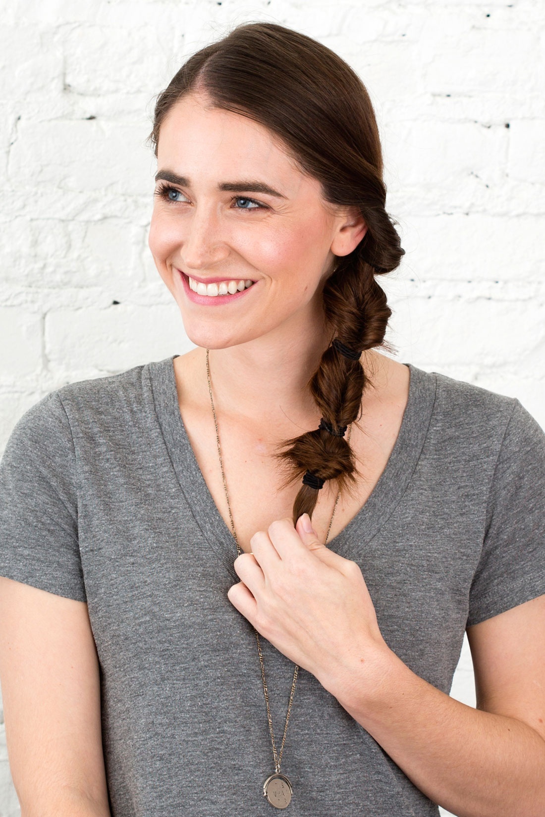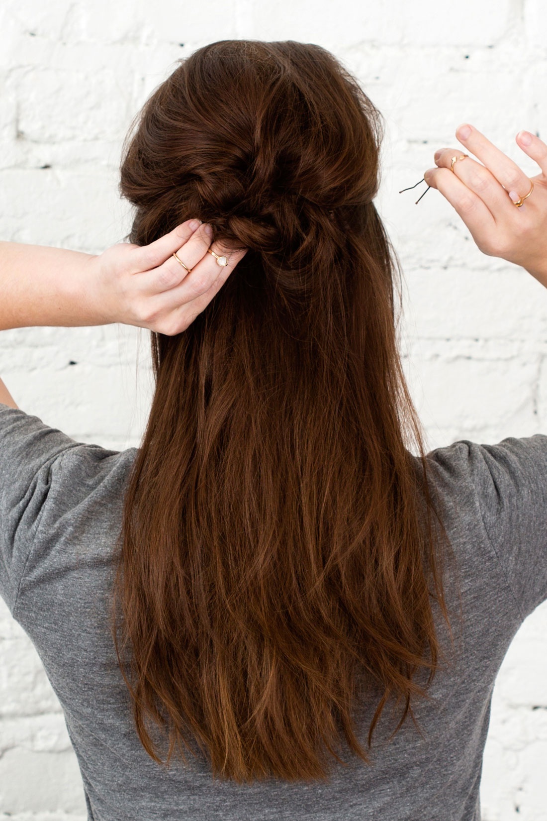 Để thực hiện kiểu tóc này, bạn chia tóc thành 3 phần, với phần tóc hai bên thái dương, xoắn chặt tóc kéo từ phía thái dương xuống dưới và cột lại với phần tóc phía sau gáy, sau khi hoàn thành dùng một phần tóc quấn quanh thun để giấu sợi thun.