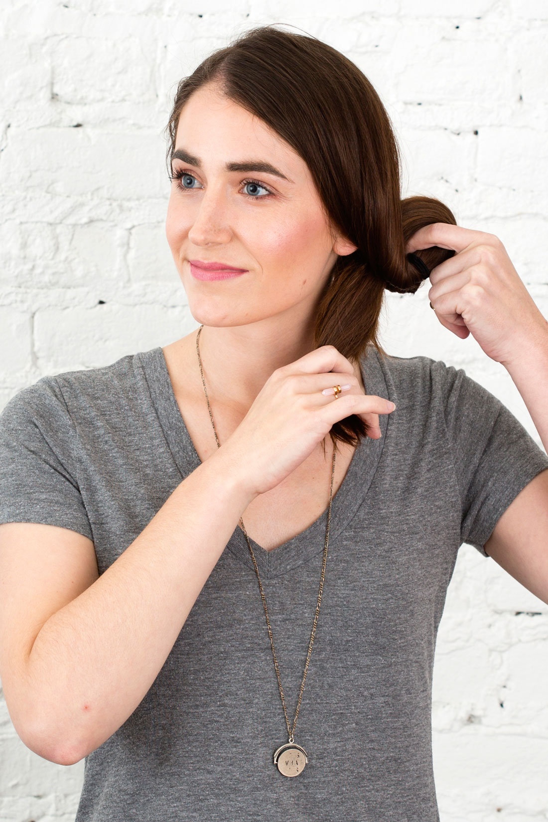 Trước tiên bạn chải gọn tóc ra phía sau, buộc tóc theo kiểu đuôi gà với một sợi thun đen, sau đó chia đôi phần tóc vừa buộc và lộn ngược đuôi tóc lại