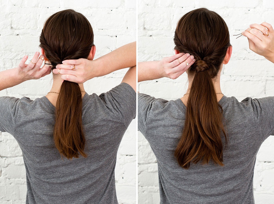 | Dùng ghim kẹp cố định, giấu đuôi tóc vào bên trong. |