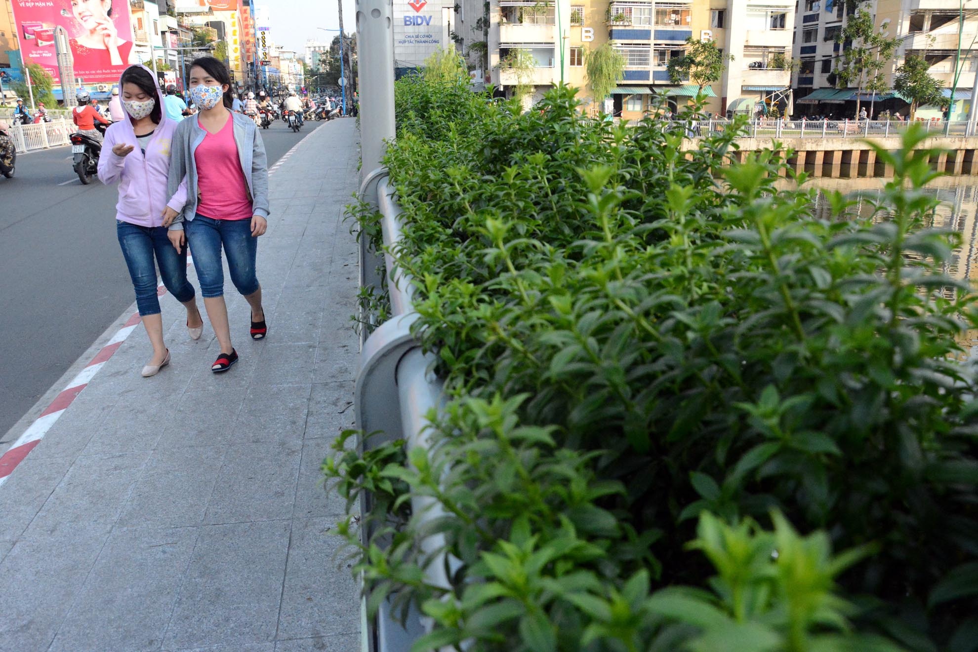 | Dọc hai bên lan can, lối đi bộ là dãy chậu hoa xanh tốt làm cho cây cầu trở nên mềm mại. |