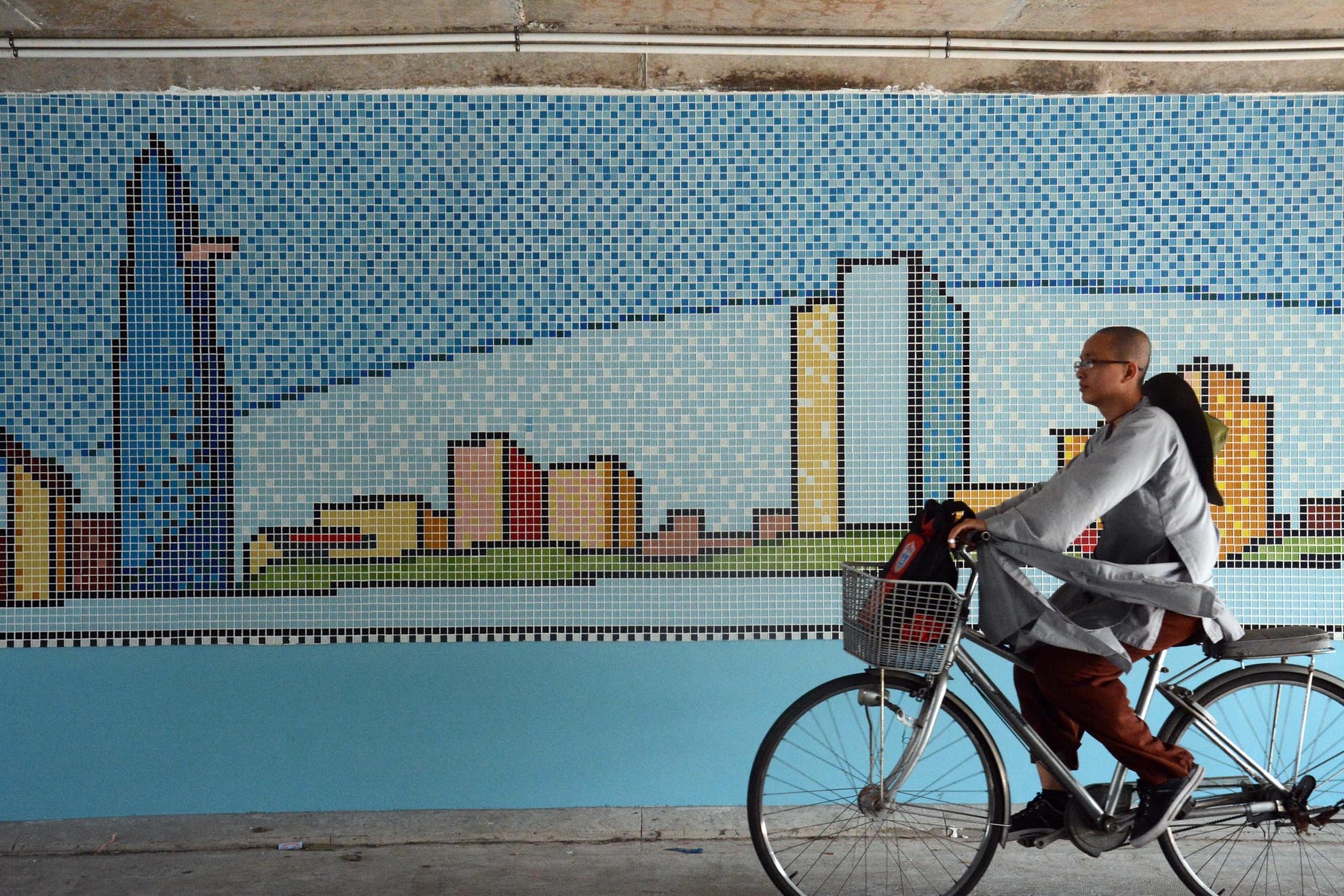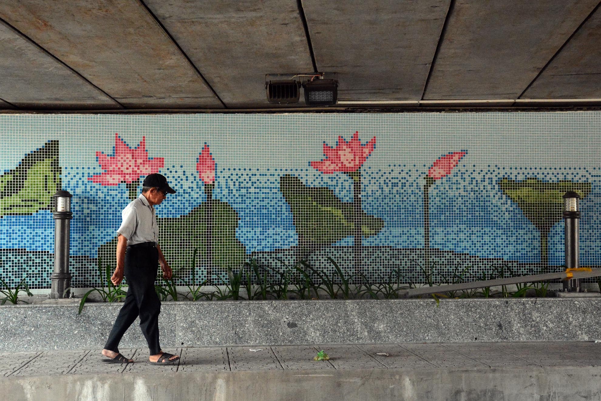 | Dưới gầm cầu cũng được trang trí tranh gốm như cầu Bông với hình các tòa nhà trung tâm thành phố. |