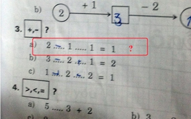 Vừa qua, một bài tập Toán lớp 1 cũng bị chỉ trích nặng nề. Cụ thể, câu hỏi số 3 yêu cầu học sinh điền dấu cộng trừ vào phép tính (2...1…1 = 1) để cho kết quả bằng 1. Nhưng trên thực tế không thể đặt dấu cộng và trừ vào phép toán này để cho ra được kết quả như vậy.