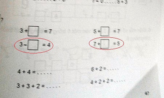 Thời gian gần đây, một bài Toán lớp 1 cũng khiến các phụ huynh băn khoăn. Đó là câu hỏi trong cuốn Bài tập ôn luyện tự kiểm tra cuối tuần toán (tập 1) của tác giả Hoàng Mai Lê, Nguyễn Đình Khuê (NXB Đại học Sư phạm). Cụ thể, bài số 4 yêu cầu học sinh làm phép tính "3 trừ mấy bằng 4" và "7 cộng mấy bằng 5". Trong khi đó, học sinh lớp 1 đang học về phép cộng, trừ trong phạm vi từ 2 đến 9.