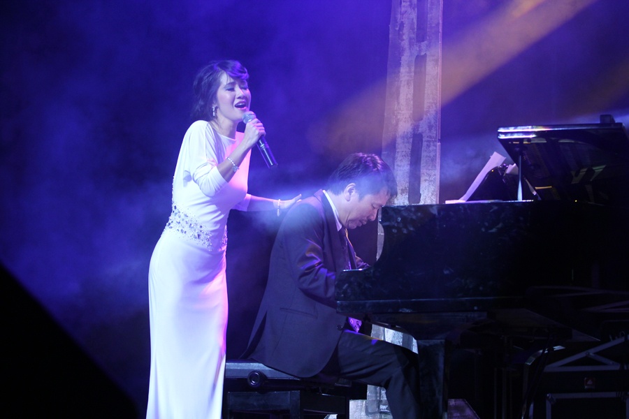 | Nhạc sĩ Phú Quang cũng tự mình chơi piano để tôn vinh tiếng hát của cô Bống. |