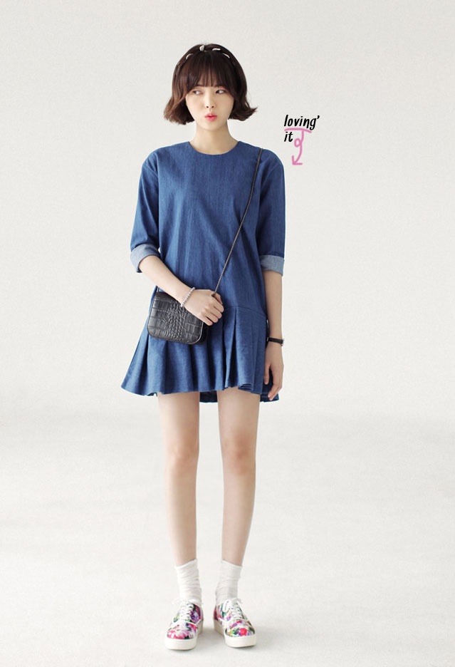 | Chiếc váy loe chất liệu denim trở nên duyên dáng khi mix kèm giày búp bê điệu đà. |