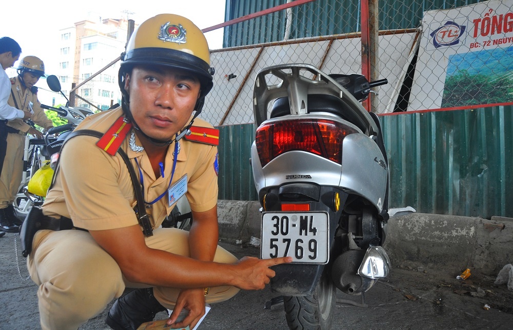 Sáng 30/9, làm nhiệm vụ ở ngã tư Cầu Giấy (Hà Nội), thiếu úy Đặng Quốc Huy và thiếu úy Nguyễn Mạnh Trí (Đội cảnh sát giao thông số 2) phát hiện người phụ nữ đi xe tay ga nhãn hiệu Lead vi phạm luật giao thông. Qua rà soát số khung và số máy, cảnh sát xác định xe này phải mang biển kiểm soát khác, người sở hữu mang tên ông Đoàn Trọng Cường ở phố Lê Duẩn, quận Ba Đình.