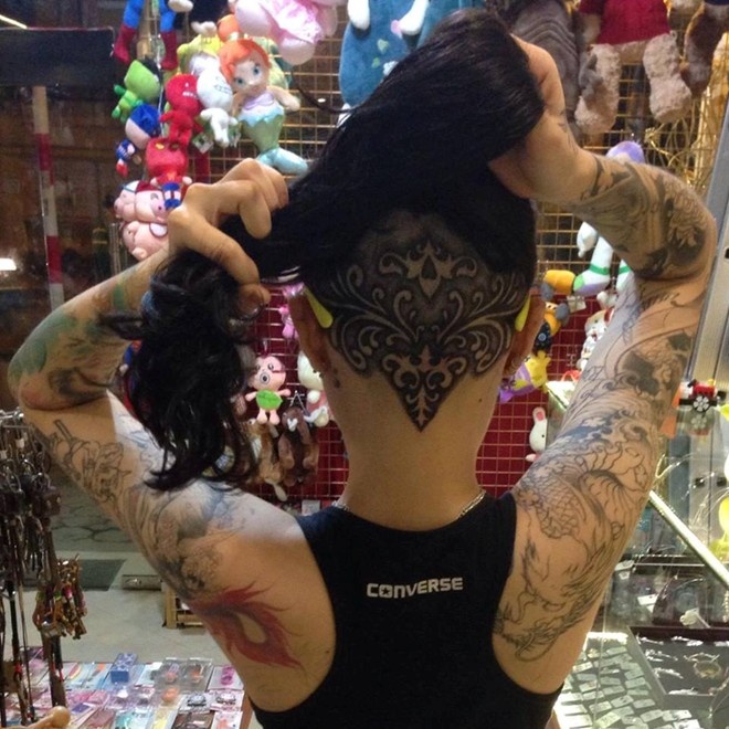 | Hình xăm trên đầu của Na Bia được thực hiện vào tháng 8/2014. Cô đã phải cạo sạch tóc ở phía sau gáy, sau đó mất hơn 7 tiếng chịu đau đớn để hoàn thiện tác phẩm. |