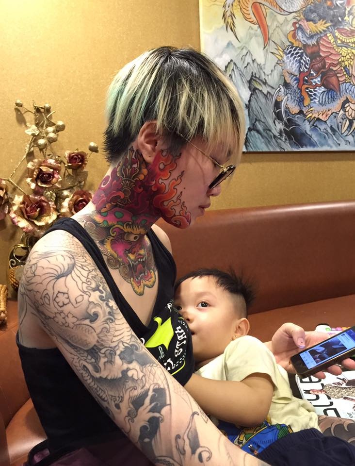 Trao đổi với Zing.vn, Ngọc Anh cho biết, kỳ lân là họa tiết mới nhất trên cổ, mặt của cô. Theo đó, trong giới xăm, hai vị trí này khá nhạy cảm và nguy hiểm. Để hoàn thiện tác phẩm lớn này, bà mẹ một con mất 19 giờ thực hiện và chia làm 3 lần.