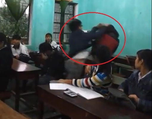| Nam sinh ngang nhiên lao vào đánh bạn ngay trong lớp học (Ảnh cắt từ clip). |