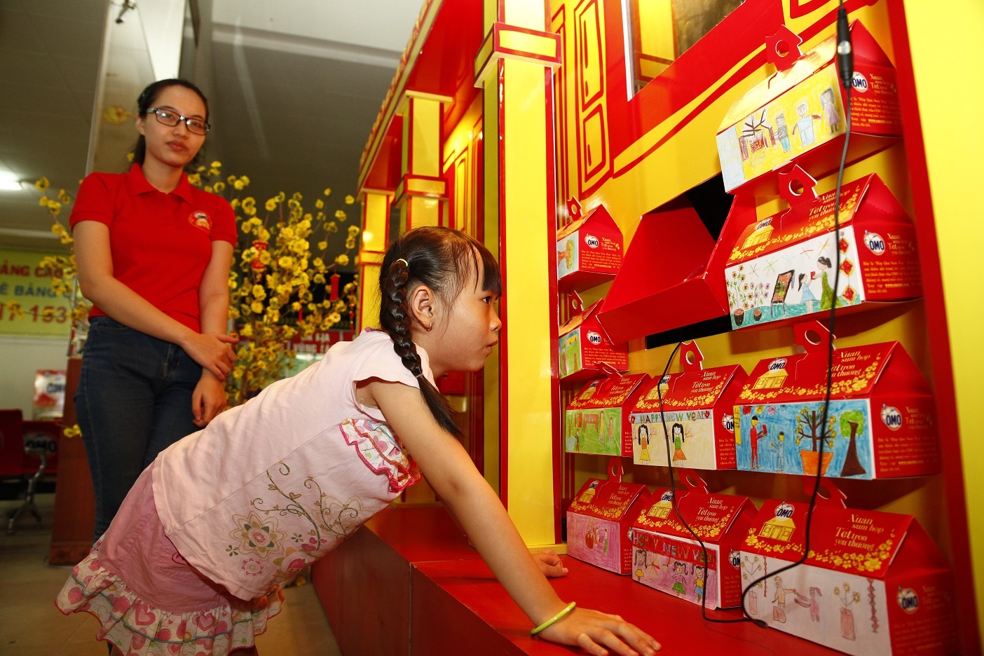 | Bé nhận ảnh để đính lên hộp quà sum họp. |